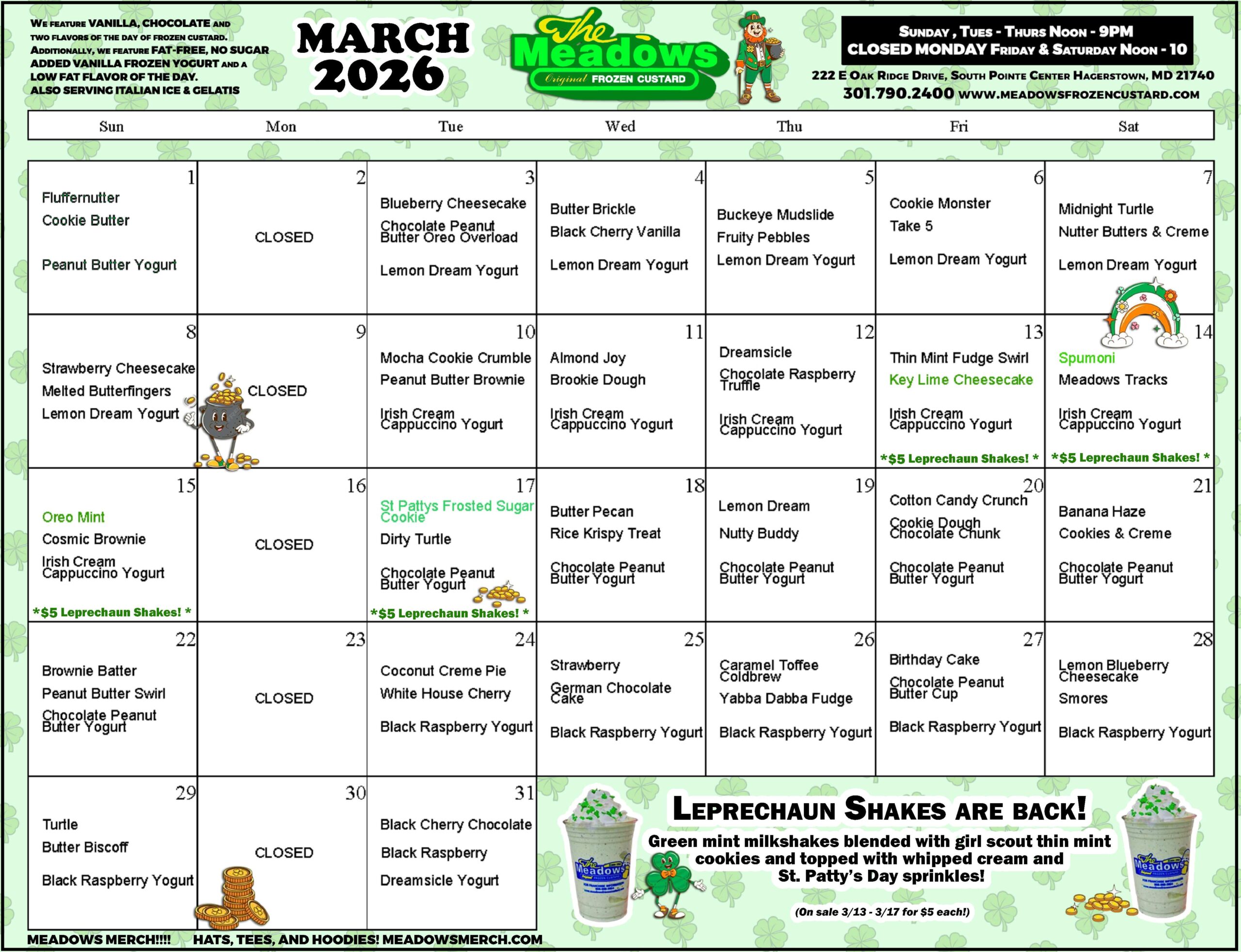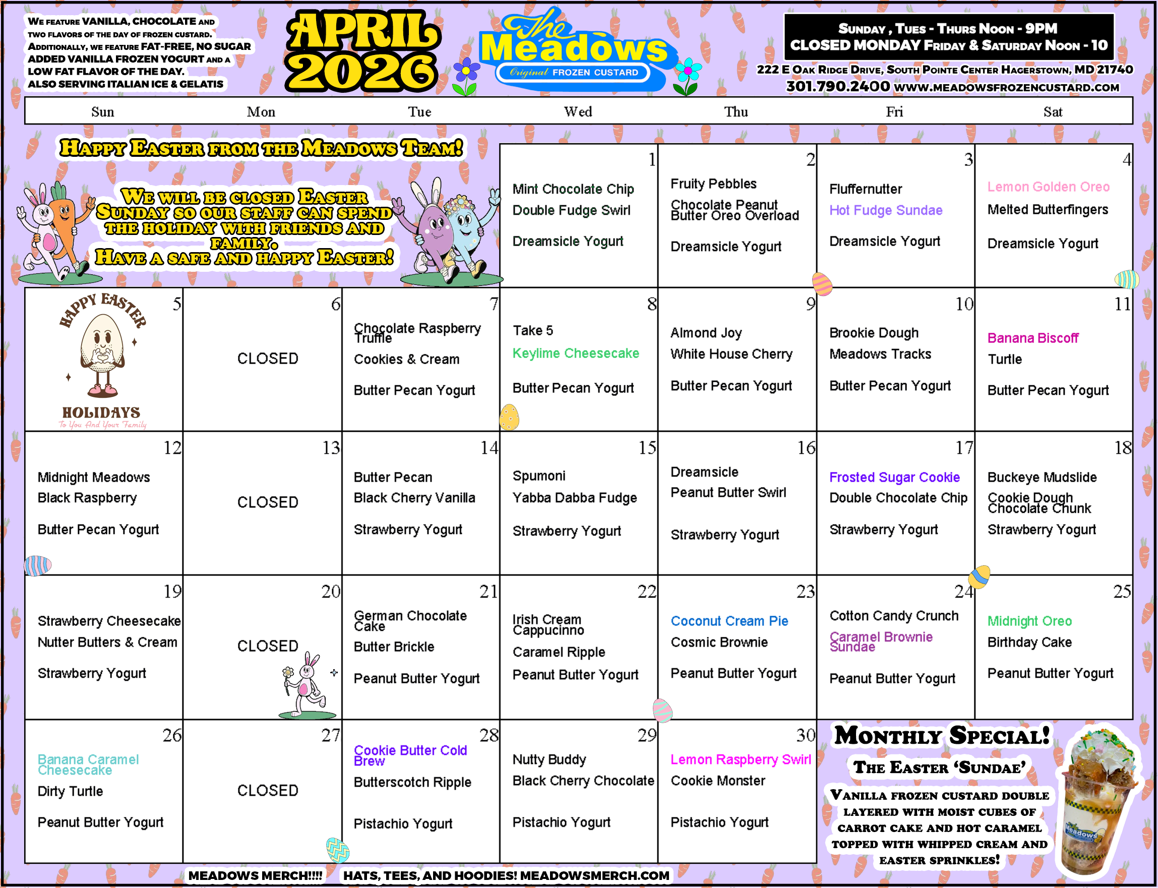 Every Meadows has its own décor and the Hagerstown location features a 50’s-style eat-in parlor with music to match, drive-thru and walk-up windows in addition to outside benches. We are closed on Mondays. Daily hours are Noon-9 pm and Noon-10 pm Friday and Saturday. Monthly calendars listing daily flavors are available on this website, on our Facebook page ‘Hagerstown Meadows Frozen Custard’ and at our location.